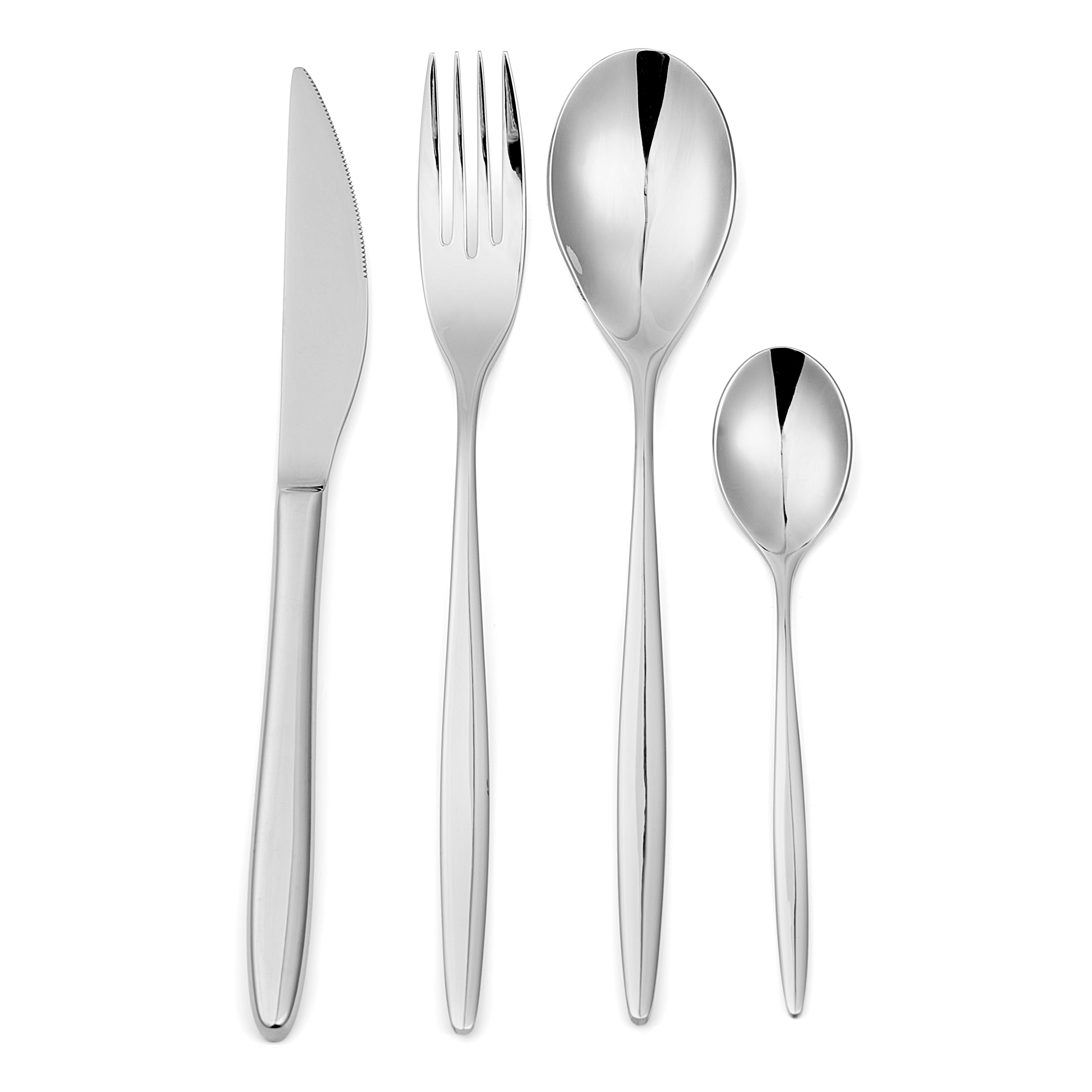 6 couteaux de table : 23,50 cm dont 10 cm de lame 6 fourchettes : 3,5 mm, 21 cm 6 cuillères : 3,5 mm, 21 cm 6 cuillères à dessert : 3 mm, 14 cm Acier 18/8 Finition Hytra brillante